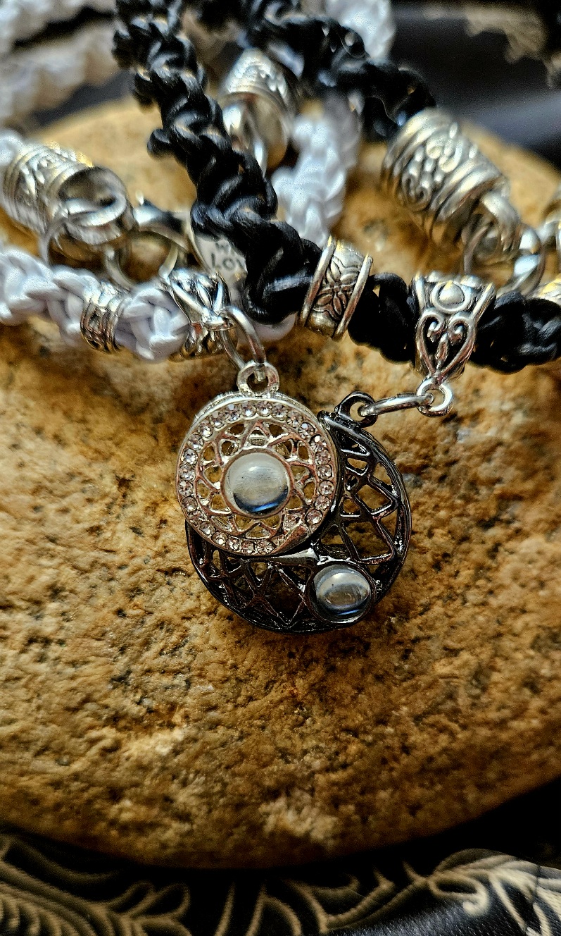 This pendant is a wonderfully romantic way to show your love and connection to that special person in your life. One pendant depicts the Sun, set with an opalescent stone and hanging from a white, hand-braided necklace in our signature double-helix style, while its mate is the depiction of the Maiden Moon in polished black finish, set with a black opalescent stone, and suspended from black hand-braided leather of identical style.